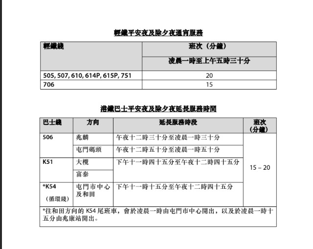 港鐵表示,為方便乘客外出歡度佳節,除夕夜(12月31日)本地鐵路線及7條輕鐵路線(505、507、610、614P、615P、706及751)將在除夕夜通宵行駛,但不包括機場快線、迪士尼線及東鐵線往返羅湖及落馬洲站。