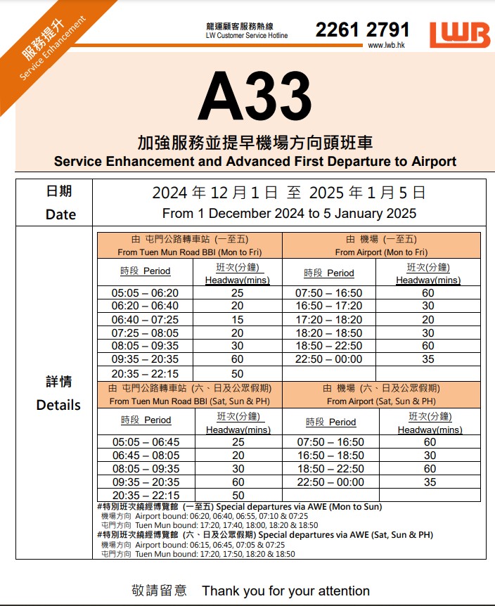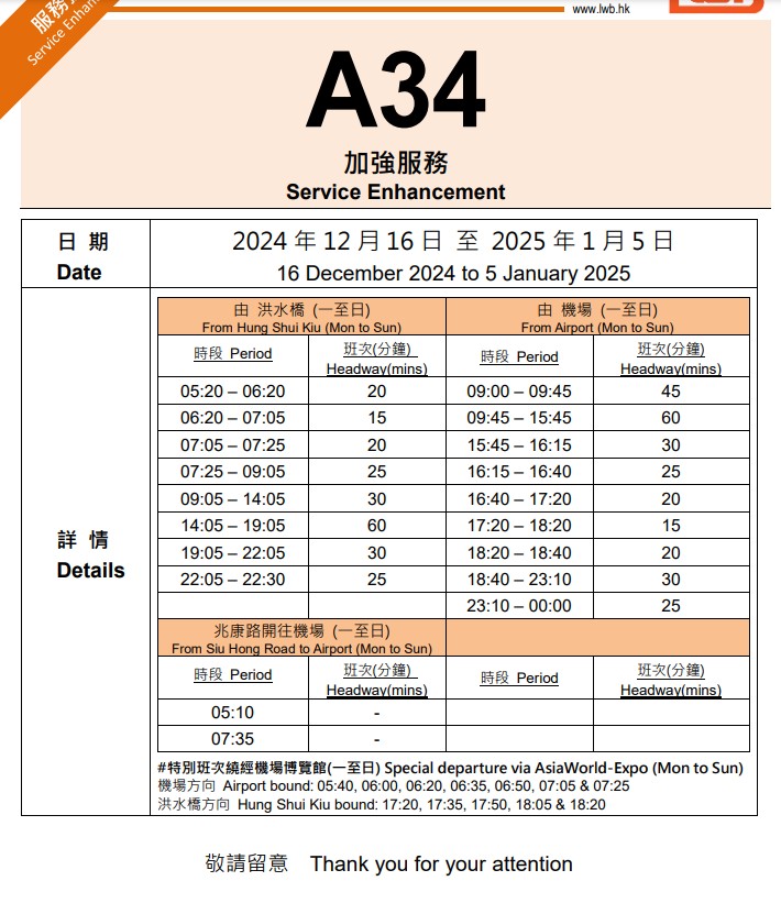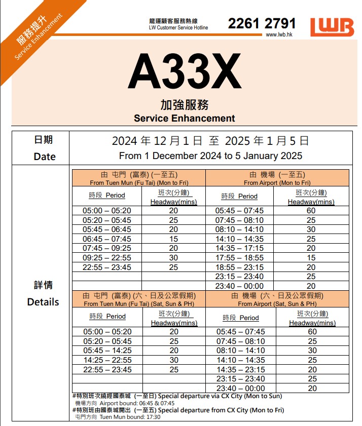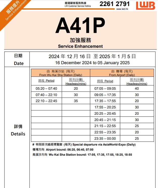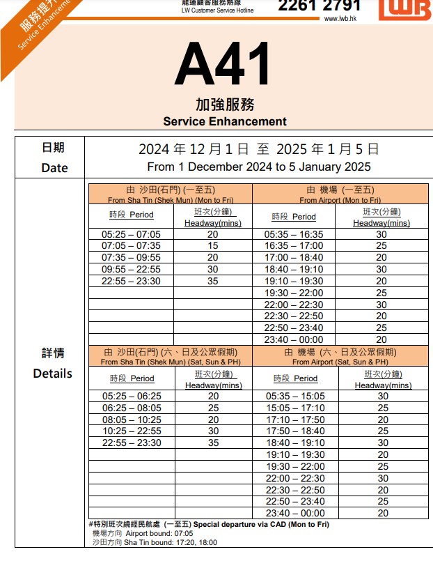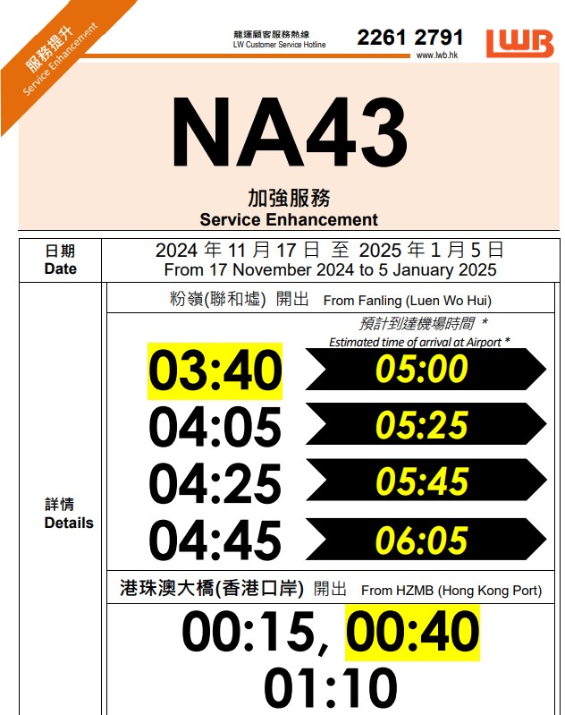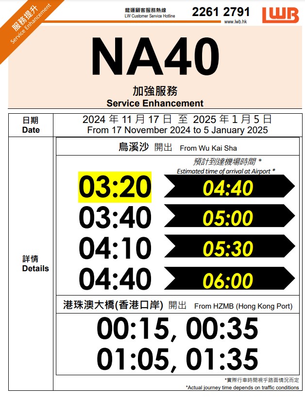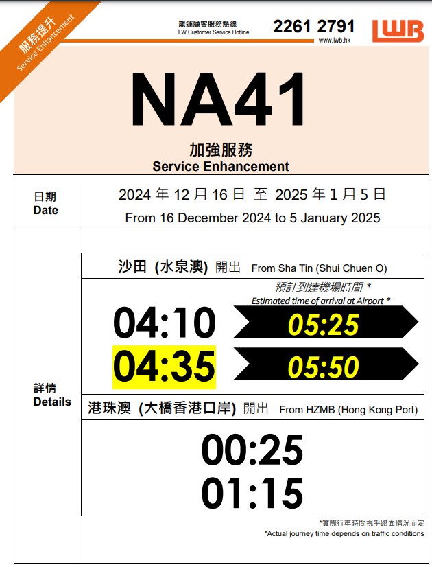 另外,由即日起至2025年2月3日,城巴加強NA路線服務,包括NA21港珠澳大橋香港口岸/機場往返旺角、NA10鴨脷洲往返機場/港珠澳大橋香港口岸、NA12杏花邨往返機場/港珠澳大橋香港口岸 、NA29將軍澳(寶琳)往返機場/港珠澳大橋香港口岸及各日間路線加強清晨時段班次,便利市民有市區前往機場。