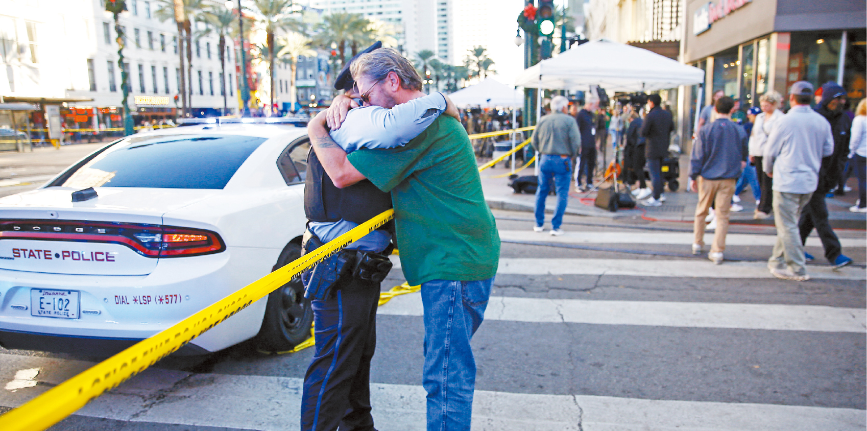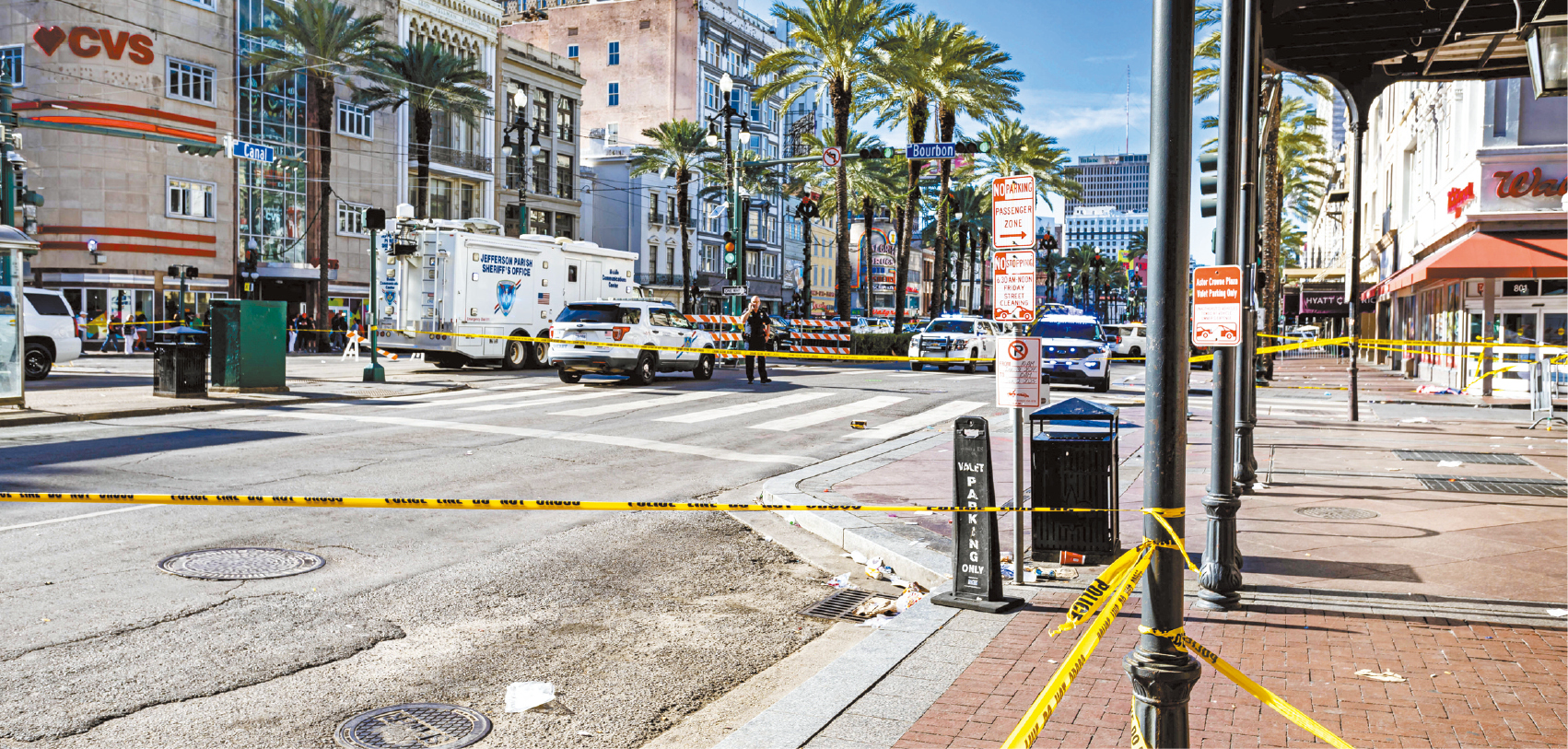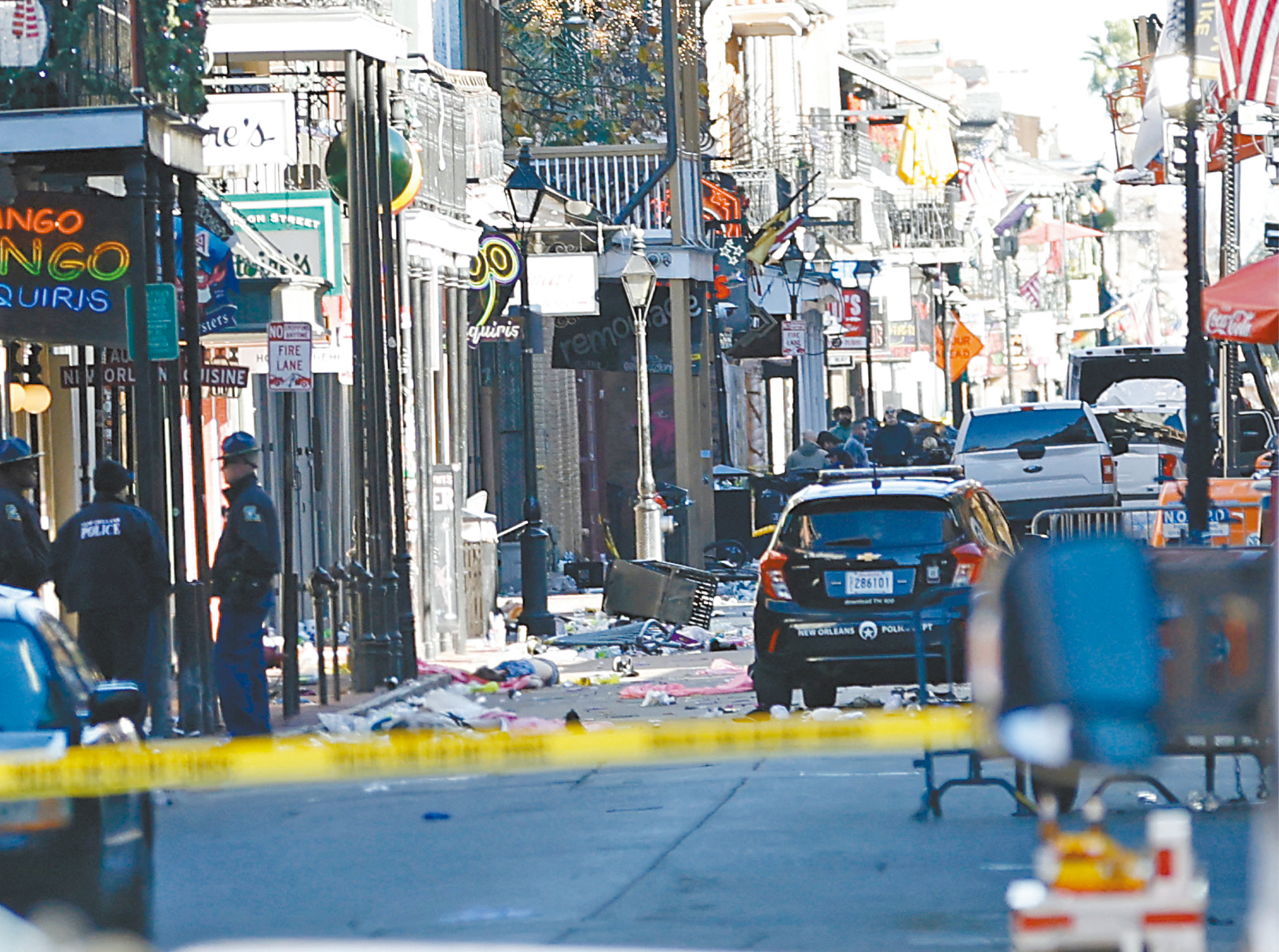 紐奧良元旦日發生汽車沖撞行人慘劇,事發地點是波旁街,現場一片狼藉。路透社