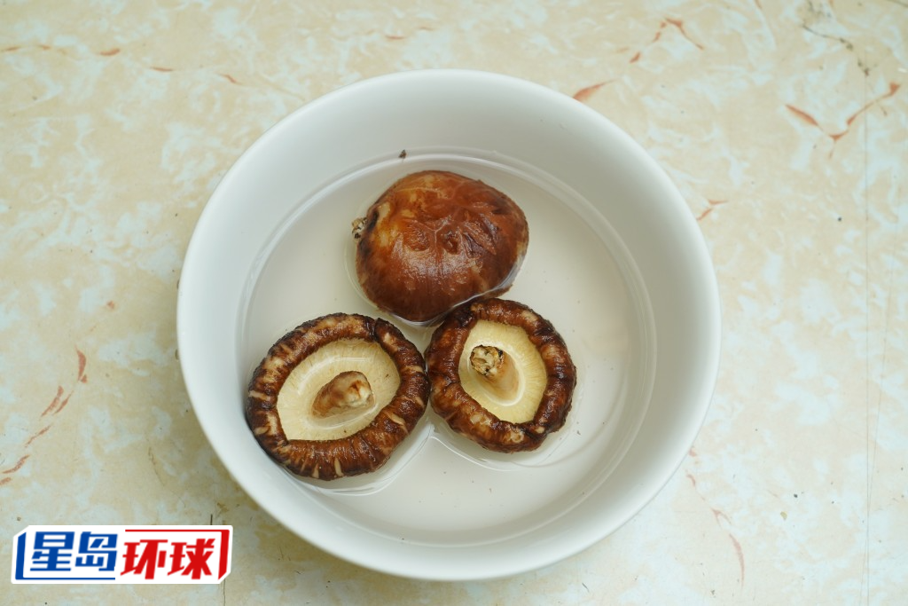 洗凈的冬菇用凍水浸過面,放入雪柜浸泡至少5小時或過夜。