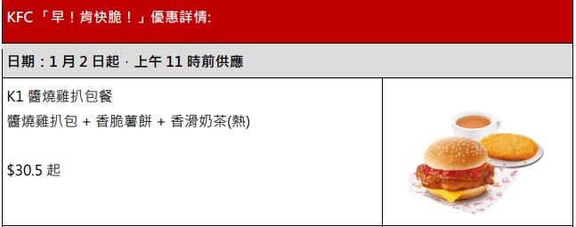 KFC “平日!肯抵 Deal!”優惠詳情|1 月 2 日起 只限星期一至五,不適用于星期一至五內之公眾假期(上午11 時前供應):