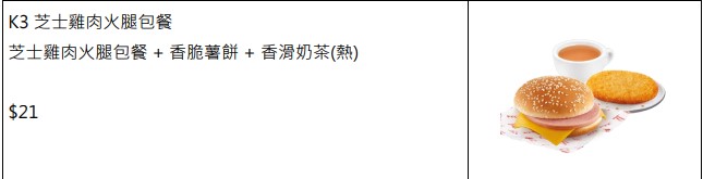 另外,過了11時后,在午餐及下午茶時段,都繼續以“肯!抵 DEAL”超值價格供應以下優惠餐點:
