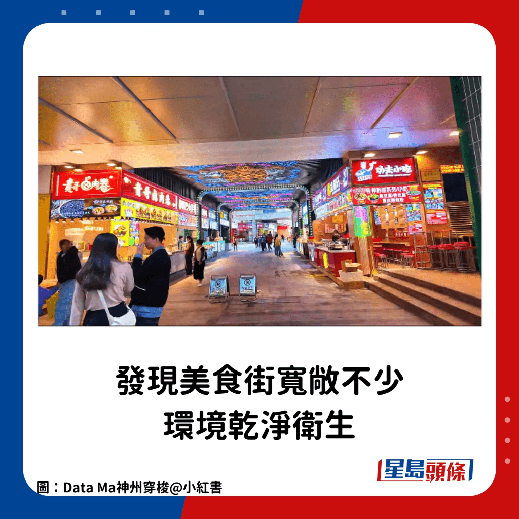 美食方面,由網民上載的片段可見美食街云集多款掃街美食,如轉轉小火鍋、手搖飲品、四川麻辣串燒、烤生蠔等,網民指雖然美食選擇大同小異,但是小店數量大減,比以前少不止三分之二,現時整個美食街區域只剩下不足一百間店鋪,直指“感覺現在的商店也沒以前那么多。突然覺得沒以前那么好逛好吃了?!?、“我都不知選吃啥了”。