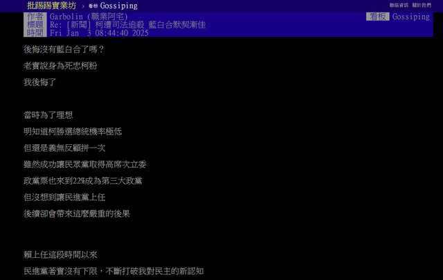 ▲柯粉小草發文,后悔當初沒有藍白合。(照片:PTT網站)