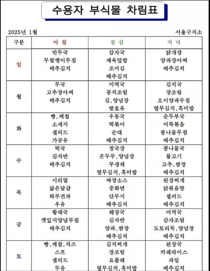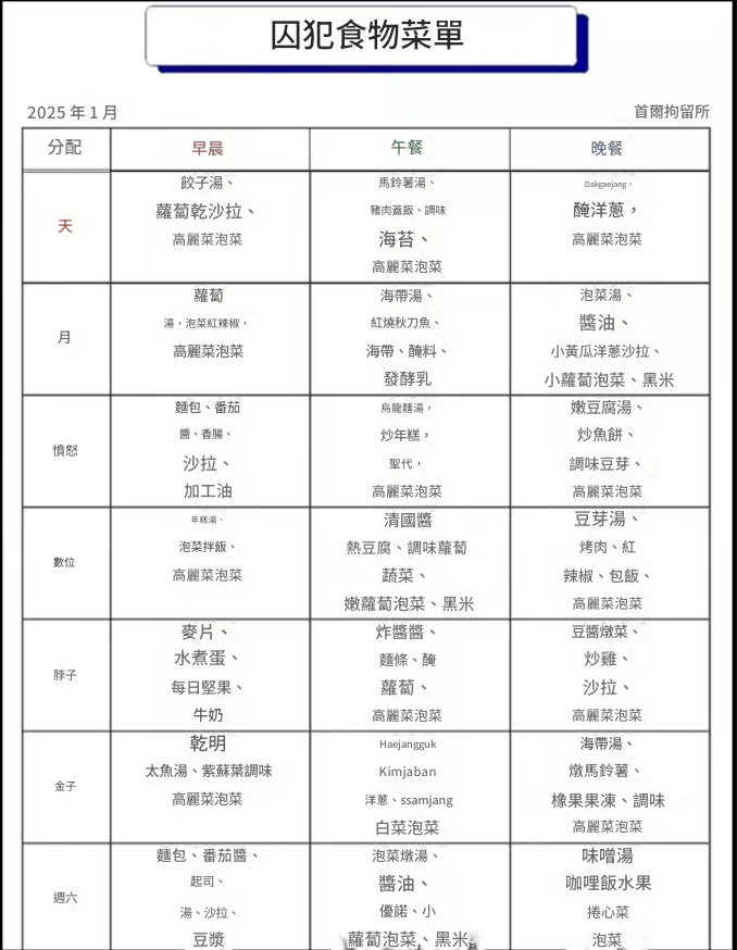 韓國網友取得首爾看守所1月的收容人飲食菜單,引發關注。文件顯示,看守所的早餐有餃子湯、蘿卜湯、香腸配面包、明太魚湯;午餐則有馬鈴薯湯、豬肉蓋飯、辣炒年糕、炸醬麵、解酒湯、泡菜湯等;而晚餐則是有香辣雞絲湯、大醬湯、辣燉雞湯、豆腐鍋和咖哩飯等。