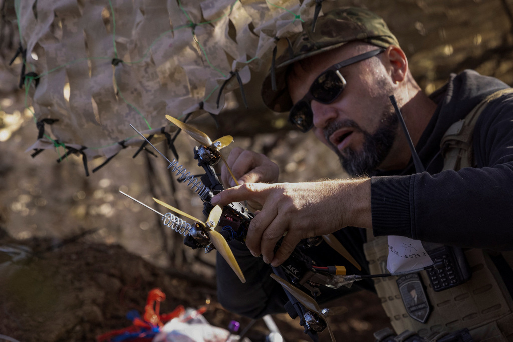 ▲烏克蘭哈爾科夫地區,一名烏克蘭軍人正在準備一架第一人稱視角無人機(FPV)。路透社