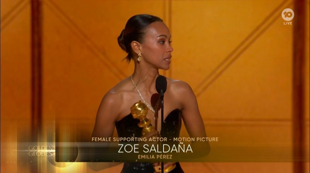 首個頒發的獎項是電影喜劇組最佳女配角,素兒莎丹娜(Zoe Saldana)憑《毒王女人夢》擊敗拍檔Selena Gomez、《魔法壞女巫》Ariana Grande等贏得獎項,她首度獲金球提名就得獎,激動得哭起來,她以英語及西班牙語感謝《毒》片其他拍檔,又指會跟拍檔分享殊榮。之后頒發劇集喜劇組最佳女主角,結果由大熱的Jeans Smart憑《職業槍手》贏得,她第3度獲金球提名,并第2度獲獎。