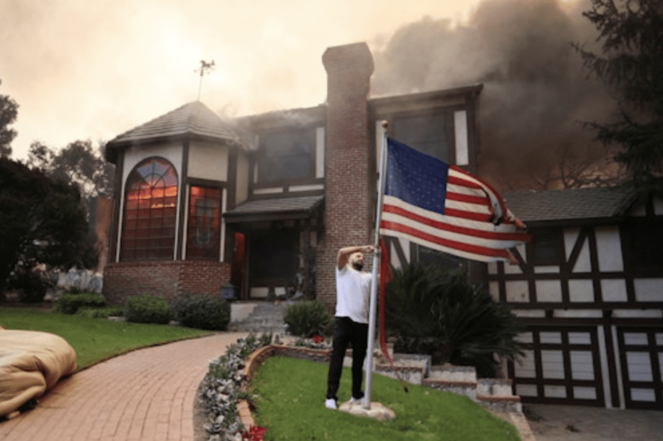 ▲美國加州阿爾塔迪納,在伊頓大火中,一名男子在燃燒的堂兄家外降下一面旗幟。路透社