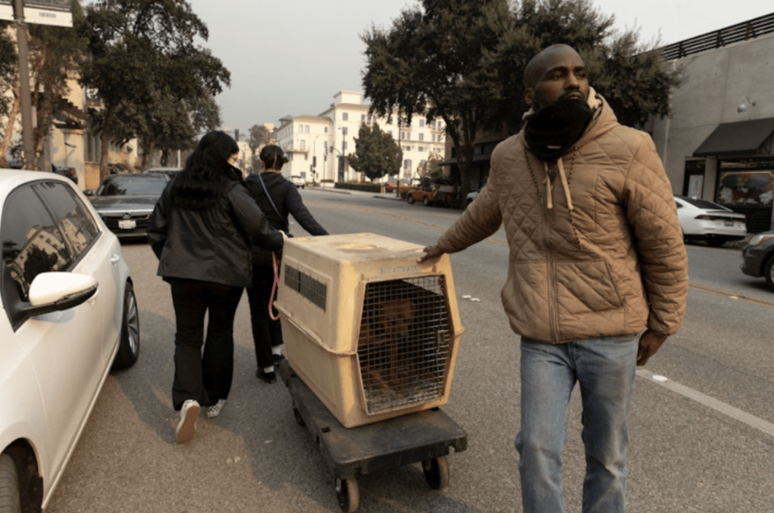 美國加州南部山火在強風和干燥天氣下持續擴大,居民帶著寵物撤離。路透社
