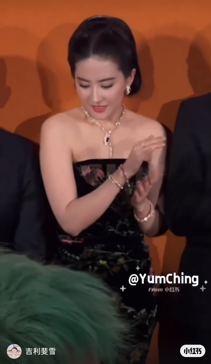 劉亦菲是晚以一身黑色有花花圖案的Low cut連身裙配襯巨型鉆飾現身活動,打扮成熟具知性美,甚有中國特色;而憑《穿著Prada的惡魔》、《悲慘世界》、《蝙蝠俠—夜神起義》等猛片成為全球知名女星的安妮·海瑟薇,則穿上金黃色低胸晚裝應戰。兩位女神見到面就拖起身攀談起來,并面貼面打招呼。