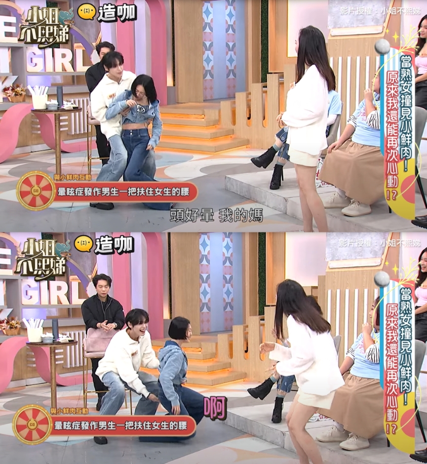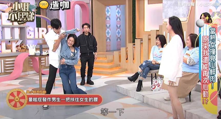 小S選出小鮮肉All in一起上演浪漫橋段,要示范“暈眩癥發作,男生一把扶住女生的腰”的帥氣動作,怎料,對方卻直接拉住小S的手,讓她上衣都快被掀起來,小S急忙喊卡、生氣表示:“哈囉,你哪行啊,我要的不是這種感覺,OK,你那個扯我的胸部快要露出來了,今天不是我要露胸部,是你們要露胸部,OK?”