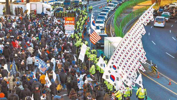 ▲韓國檢調3日前往尹錫悅總統官邸執行逮捕令,遭到總統警衛處200多名軍警阻攔,經5個半小時對峙后,檢調放棄行動無功而返。圖為支持尹錫悅的群眾在總統官邸附近抗議。(路透)