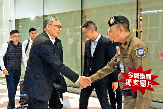 卓孝業抵達泰國機場時,與接機官方人員握手。