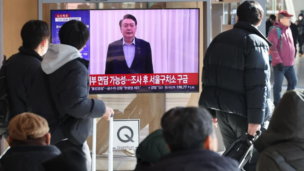 首爾車站的民眾觀看尹錫悅被捕的電視新聞報導。