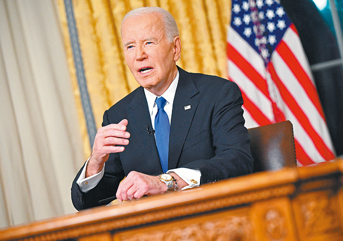 即將卸任的總統拜登,15日晚在白宮橢圓形辦公室向全國發表告別演講。 路透社