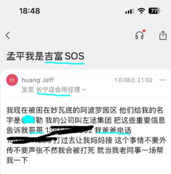 而近期網上也流傳一則日期為1月8日的求救信息,求救信息由番禺路店的店長“黃吉富”發出,由認識“黃吉富”的長寧店經理“孟平”曝光?!包S吉富”稱目前身處妙瓦底的阿波羅園區,并稱詐騙集團為他取了代號“希特勒”。該名員工提到,集團的名稱為“左洆集團”,并提供家人的聯絡方式,希望外界能通知其母親,也懇求外界不要聲張,因為一旦消息走漏,他可能會被打死。