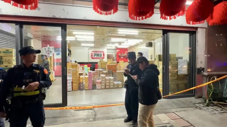 ▲警方在被黑幫闖入開槍殺人的飲料批發店調查。中時