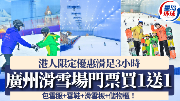 近日廣州熱雪奇跡滑雪場推出港人限定門票優惠,于2月7日晚上9時起,只要透過Klook預訂即可享買1送1,3小時初級道滑雪門票只需$427起,即平均每小時$142即可任玩2條滑雪道,更可免費借用滑雪服、滑雪鞋、頭盔、滑雪板、滑雪杖等滑雪裝備以及儲物柜,不可錯過!