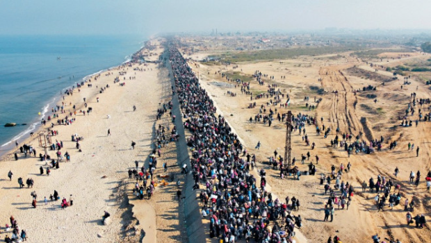 上月27日由無人機拍攝畫面可見,曾被逼遷徙至加沙南部的大批巴人,正返回加沙北部的家園。
