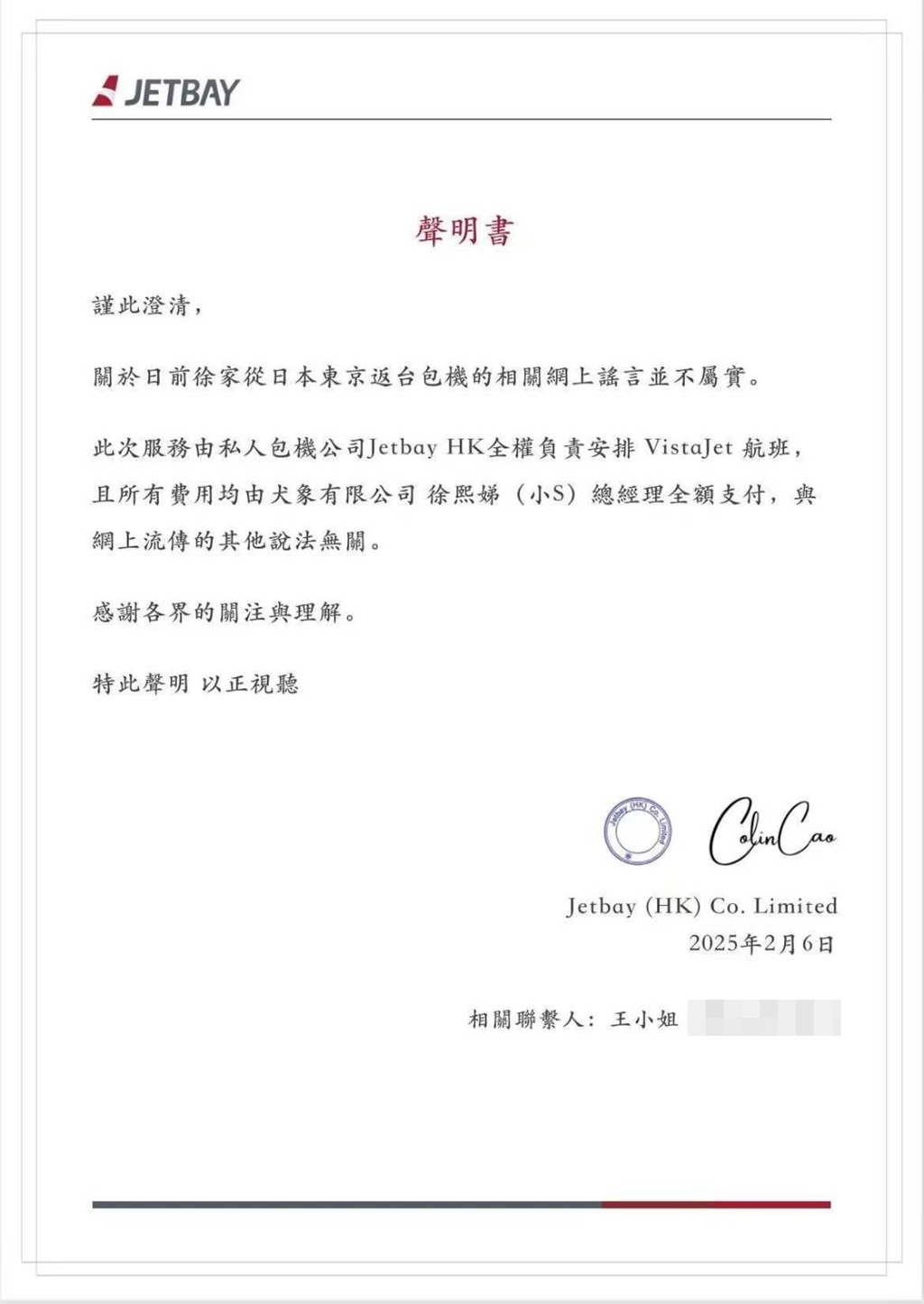 私人包機公司JETBAY也同步發聲明說:“謹此澄清,關于日前徐家從日本東京返臺包機的相關網上謠言并不屬實。此次服務由私人包機公司Jetbay HK全權負責安排VistaJet航班,且所有費用均由犬象有限公司徐熙娣(小S)總經理全額支付,與網上流傳的其他說法無關。感謝各界的關注與理解。特此聲明 以正視聽。Jetbay (HK) Co. Limited”,打臉了網紅稱是由汪小菲出資送大S骨灰回臺的說法。