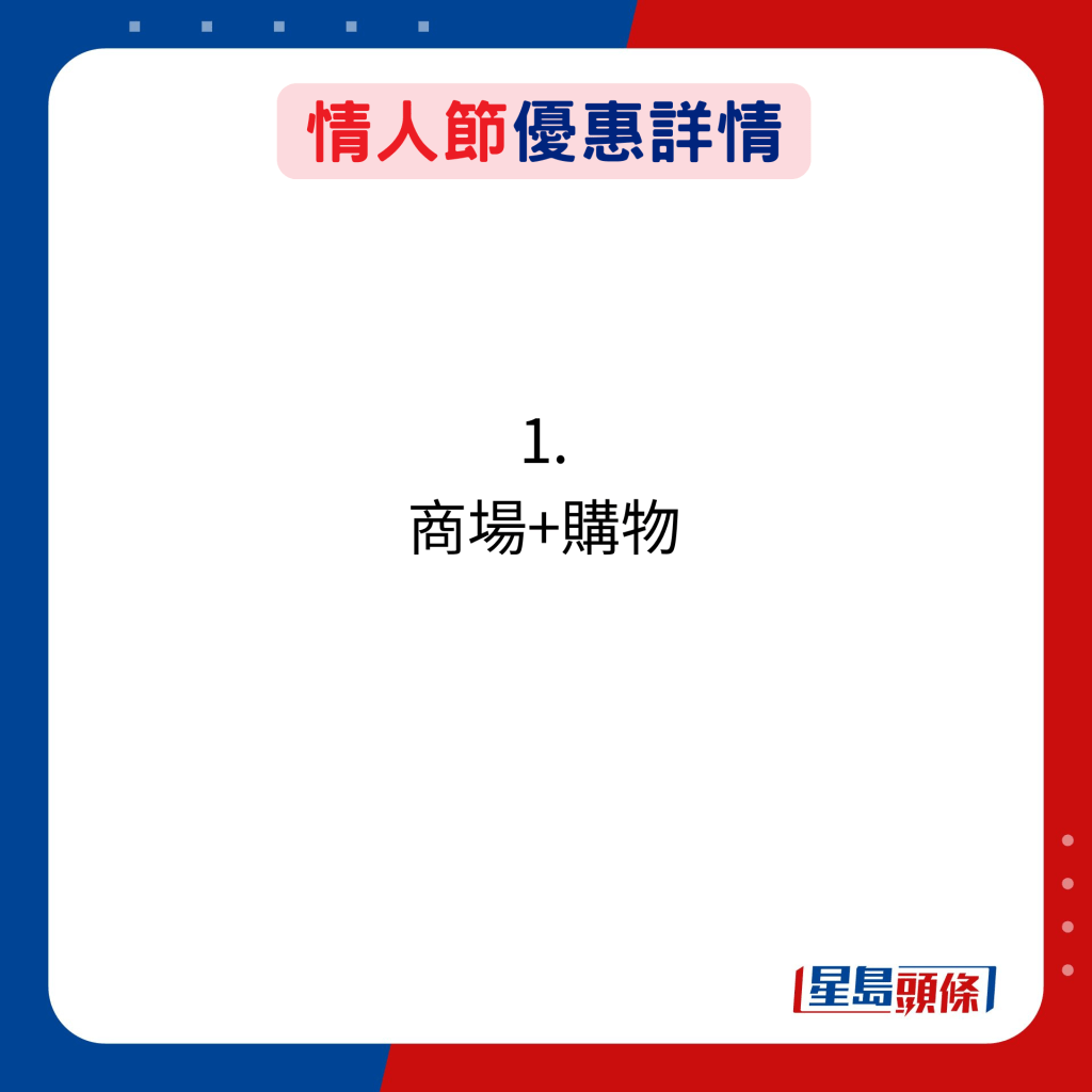為迎接情人節,坊間商場除有特色打卡裝置,更提供消費優惠,好讓情侶們一站式慶祝浪漫佳節。旺角MOKO新世紀廣場伙拍香港本地插畫家Cheeky Cheeky厚面子,特設適合打卡的厚想在紅綠燈遇到愛及厚想熊抱你等限定主題裝置。 于2月14日當天在場內以電子貨幣單一消費滿$100,即可獲贈絨布仿真玫瑰花。灣仔利東街中庭桃花園設有12棵桃花樹及心形拱門,營造浪漫氣氛,于2月12日元宵節及2月14日情人節以電子消費滿$50,憑即日發票及追蹤利東街社交平臺,可于指定時間享用專業攝影師的攝影服務及即場打印相片,跟另一半留下甜蜜回憶。