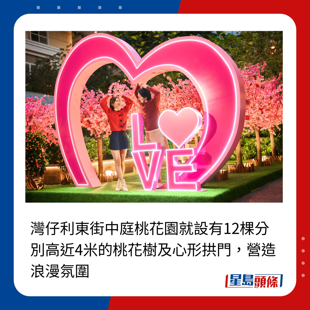 灣仔利東街中庭桃花園就設有12棵分別高近4米的桃花樹及心形拱門,營造浪漫氛圍