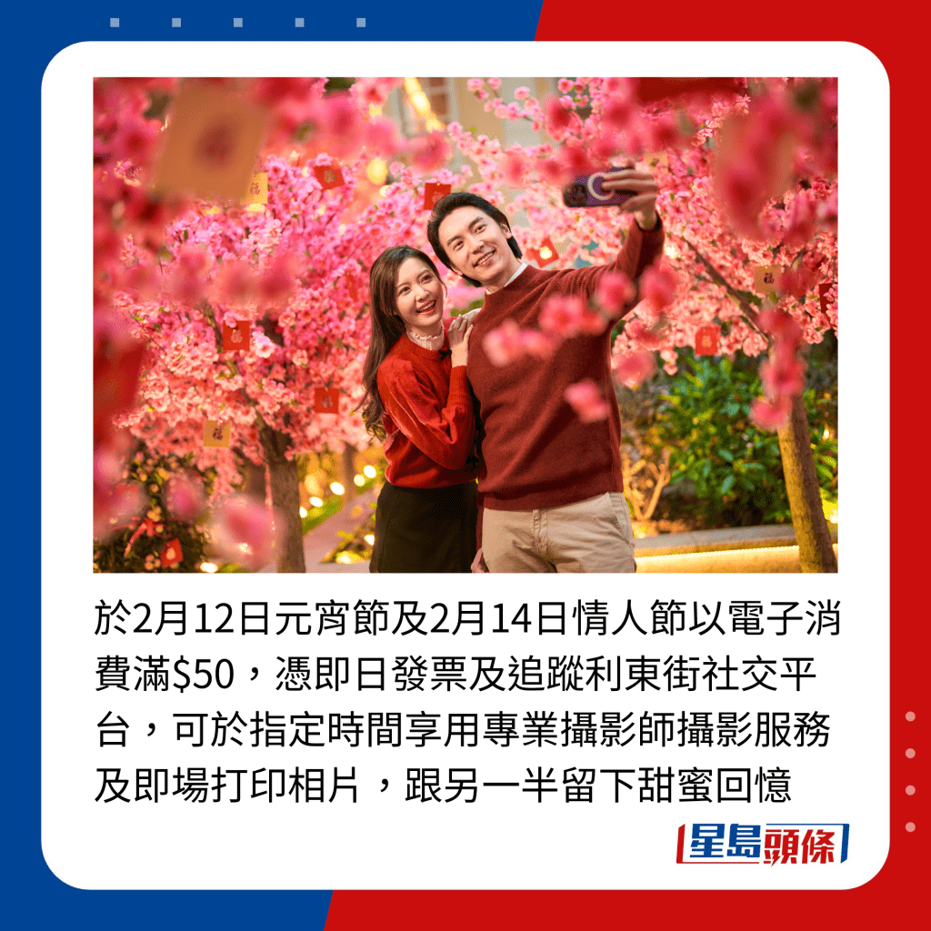 于2月12日元宵節及2月14日情人節以電子消費滿$50,憑即日發票及追蹤利東街社交平臺,可于指定時間享用專業攝影師攝影服務及即場打印相片,跟另一半留下甜蜜回憶