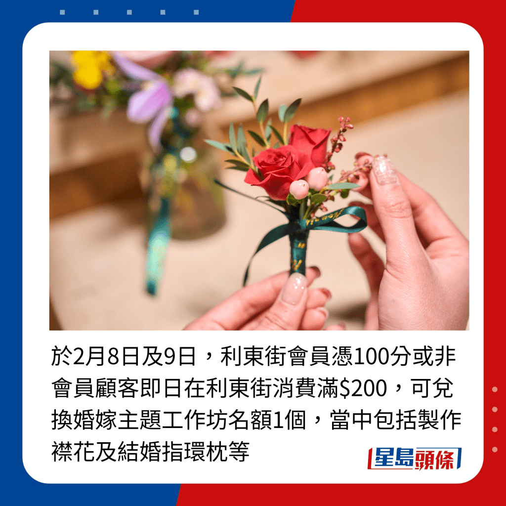 于2月8日及9日,利東街會員憑100分或非會員顧客即日在利東街消費滿$200,可兌換婚嫁主題工作坊名額1個,當中包括制作襟花及結婚指環枕等