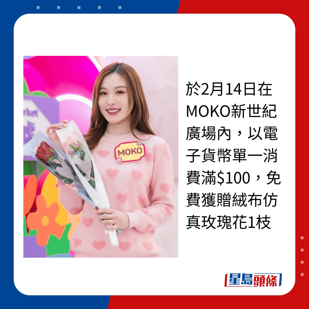 于2月14日在MOKO新世紀廣場內,以電子貨幣單一消費滿$100,免費獲贈絨布仿真玫瑰花1枝