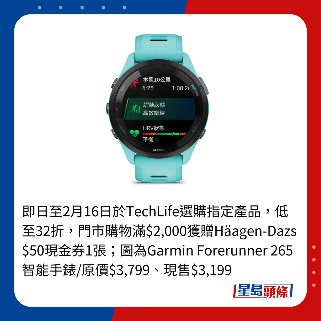 ▲即日至2月16日于TechLife選購指定產品,低至32折,門店購物滿$2,000獲贈H?agen-Dazs $50現金券1張; 圖為Garmin Forerunner 265智能手表/原價$3,799、現售$3,199。