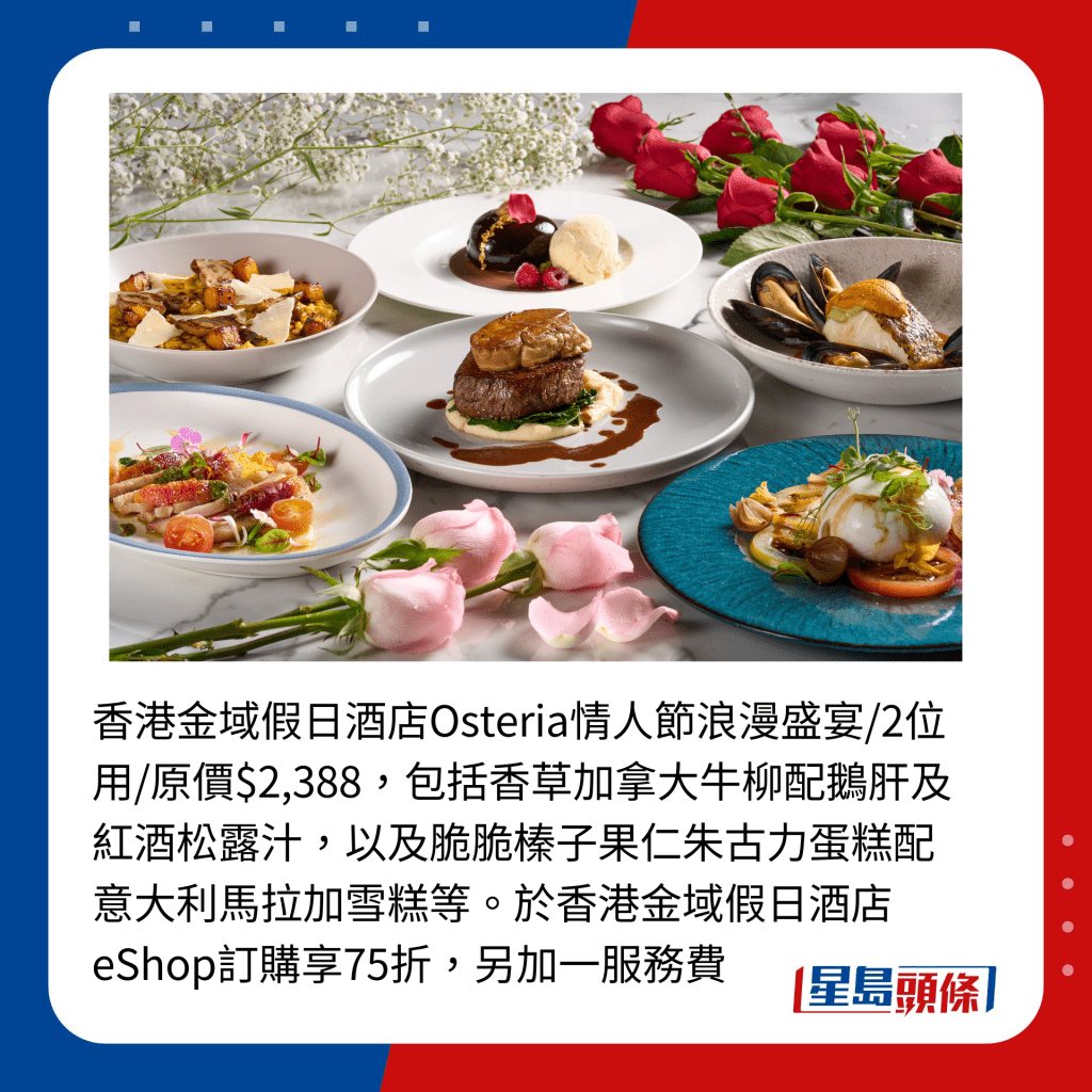 ▲香港金域假日酒店Osteria情人節浪漫盛宴/2位用/原價$2,388,包括香草加拿大牛柳配鵝肝及紅酒松露汁,以及脆脆榛子果仁朱古力蛋糕配意大利馬拉加雪糕等。于香港金域假日酒店eShop訂購享75折,另加一服務費。