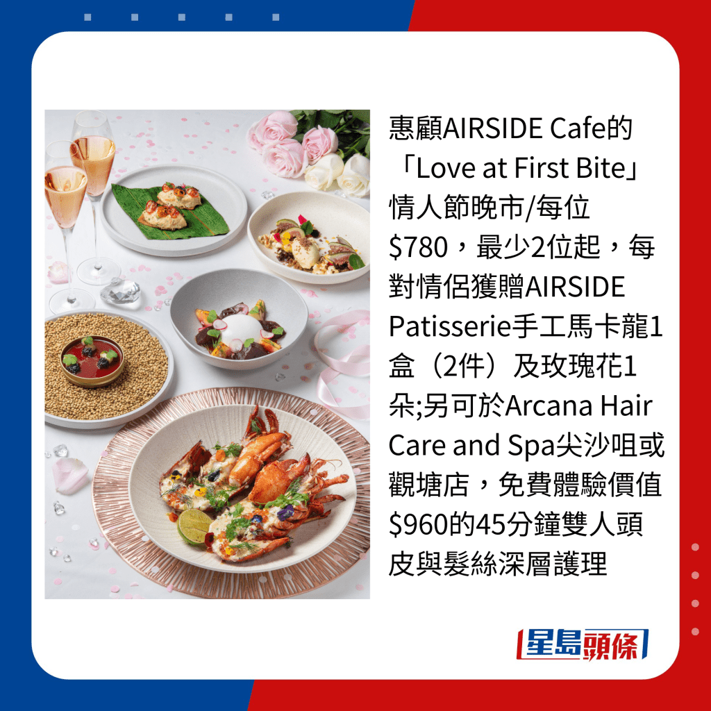 ▲惠顧AIRSIDE Cafe的“Love at First Bite”情人節晚市/每位$780,最少2位起,每對情侶獲贈AIRSIDE Patisserie手工馬卡龍1盒(2件)及玫瑰花1朵; 另可于Arcana Hair Care and Spa尖沙咀或觀塘店,免費體驗價值$960的45分鐘雙人頭皮與發絲深層護理。