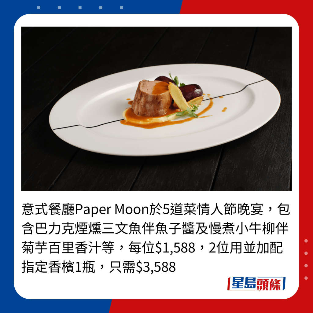 意式餐廳Paper Moon于5道菜情人節晚宴,包含巴力克煙熗三文魚伴魚子醬及慢煮小牛柳伴菊芋百里香汁等,每位$1,588,2位用并加配指定香檳1瓶,只需$3,588