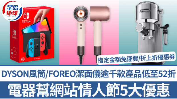 情人節快到了,大家準備好禮物送給另一半了嗎?電器幫ElecBoy由即日起至2月14日,推出指定金額免運費、折上折優惠券、信用卡專屬優惠等情人節5大優惠。 另外,全網過千款產品包括DYSON風筒、FOREO潔面儀、BRAUN須刨等低至52折,方便大家于這個佳節為另一半準備最貼心又貼身的禮物!