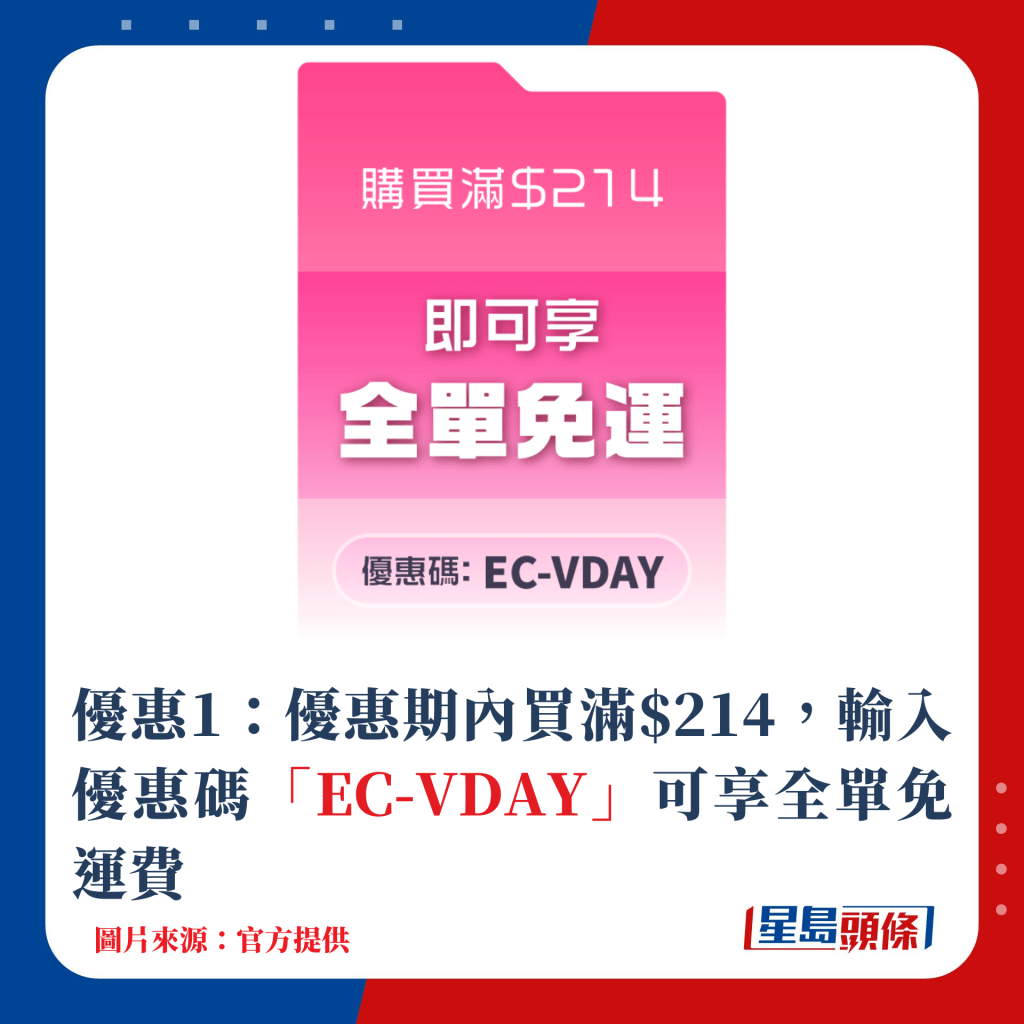 優惠1:優惠期內買滿$214,輸入優惠碼「EC-VDAY」可享全單免運費