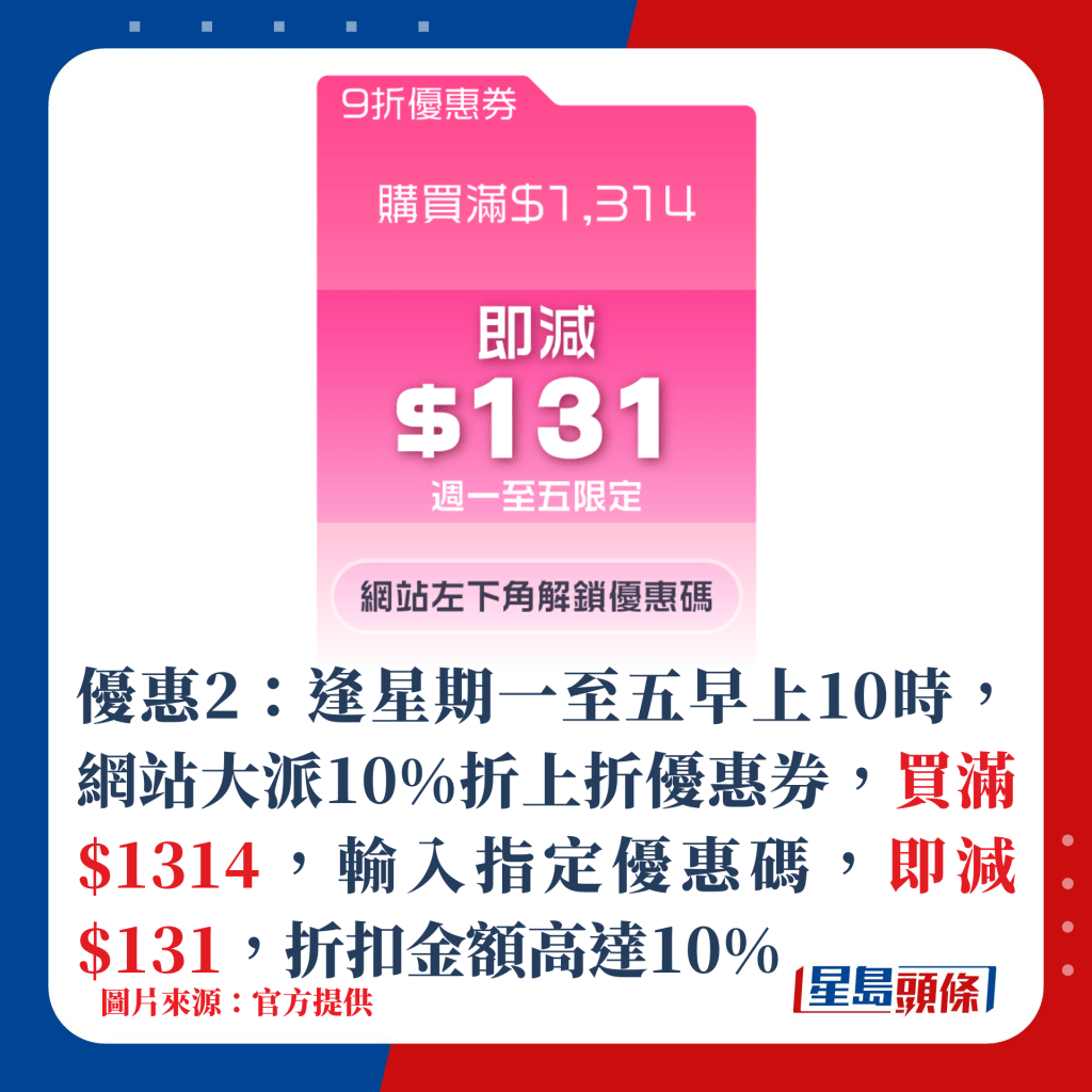 優惠2:逢星期一至五早上10時,網站大派10%折上折優惠券,買滿$1314,輸入指定優惠碼,即減$131,折扣金額高達10%