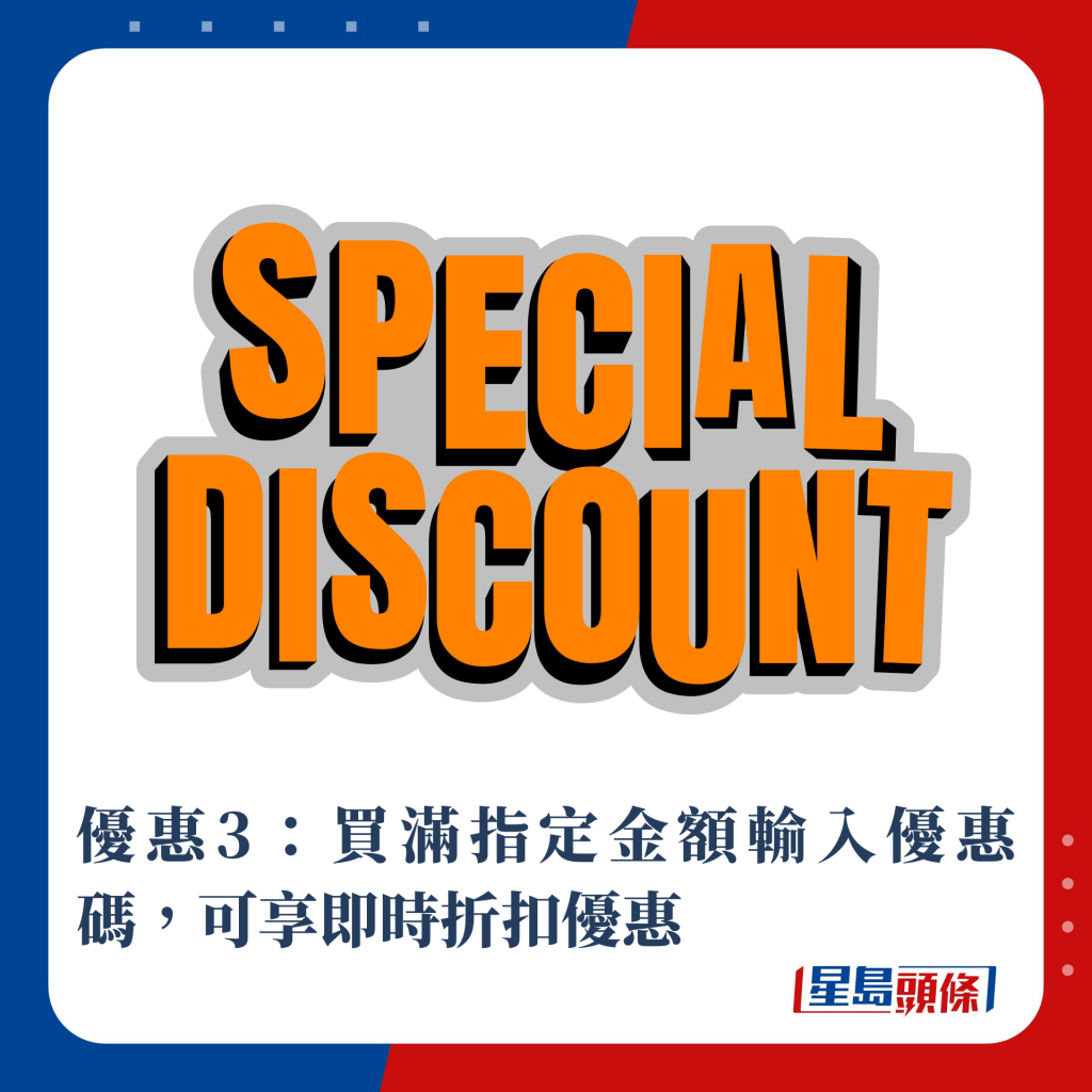 優惠3:買滿指定金額輸入優惠碼,可享即時折扣優惠