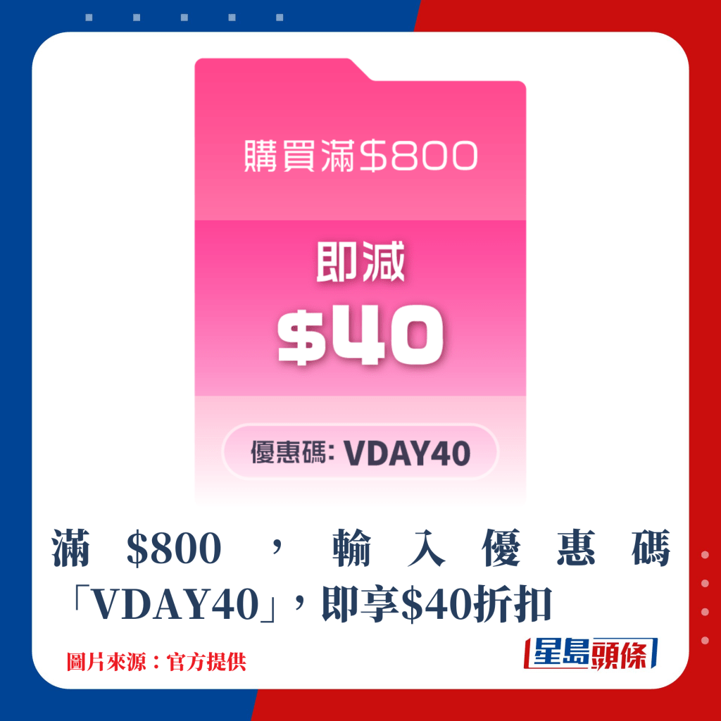 ▲滿$800,輸入優惠碼“VDAY40”,即享$40折扣