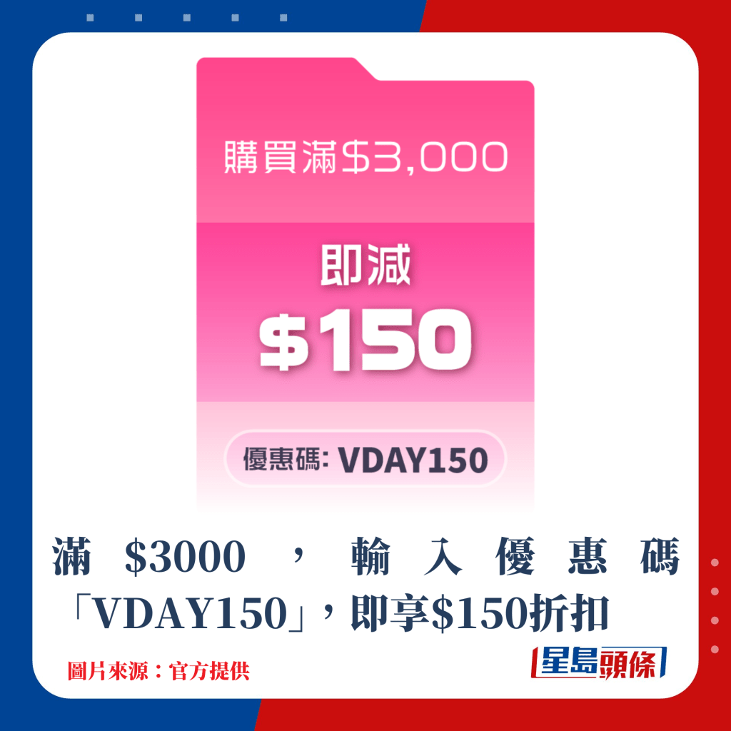 ▲滿$3000,輸入優惠碼“VDAY150”,即享$150折扣
