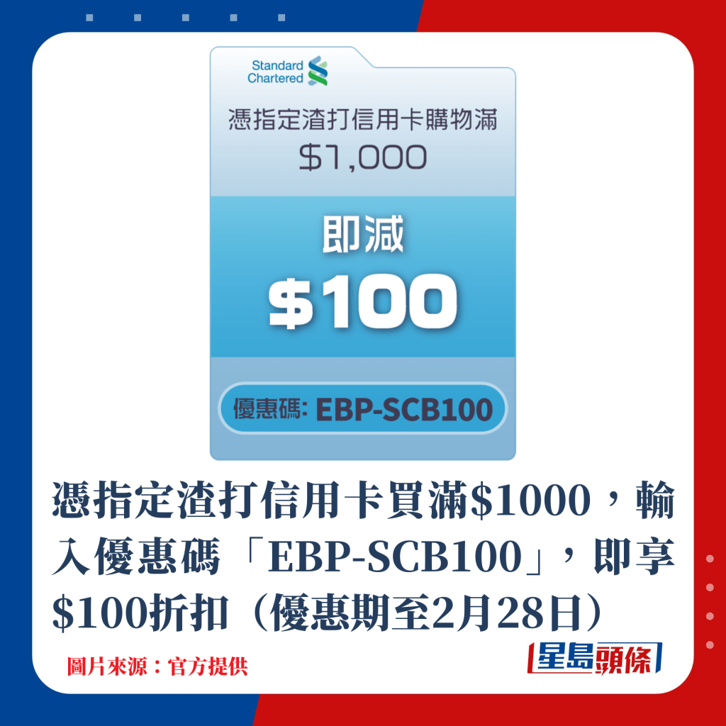 憑指定渣打信用卡買滿$1000,輸入優惠碼「EBP-SCB100」,即享$100折扣(優惠期至2月28日)