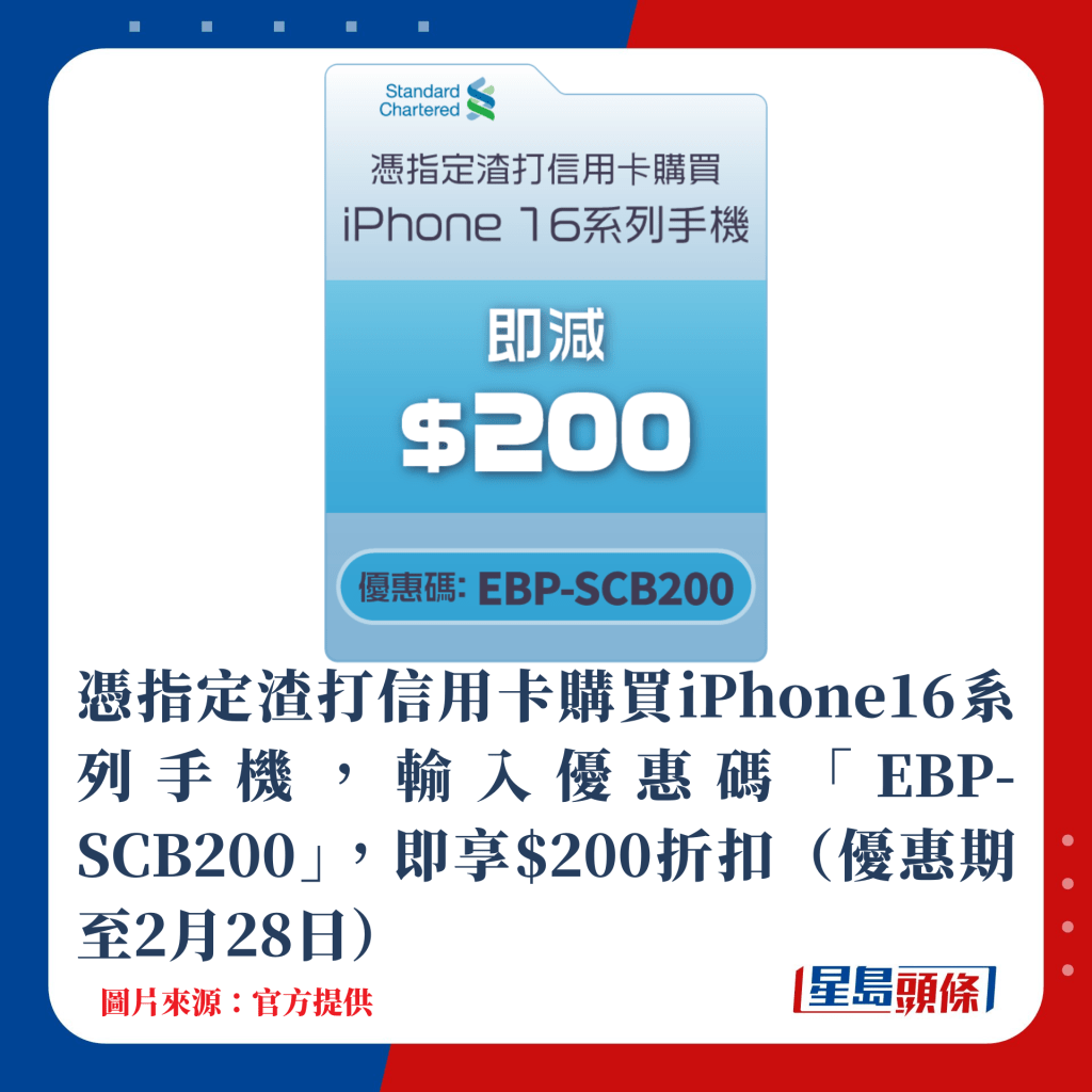 憑指定渣打信用卡購買iPhone16系列手機,輸入優惠碼「EBP-SCB200」,即享$200折扣(優惠期至2月28日)