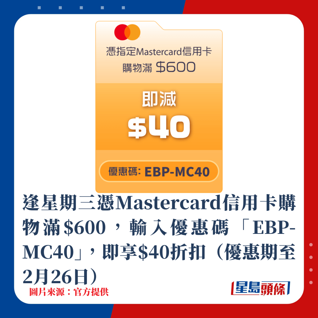 逢星期三憑Mastercard信用卡購物滿$600,輸入優惠碼「EBP-MC40」,即享$40折扣(優惠期至2月26日)