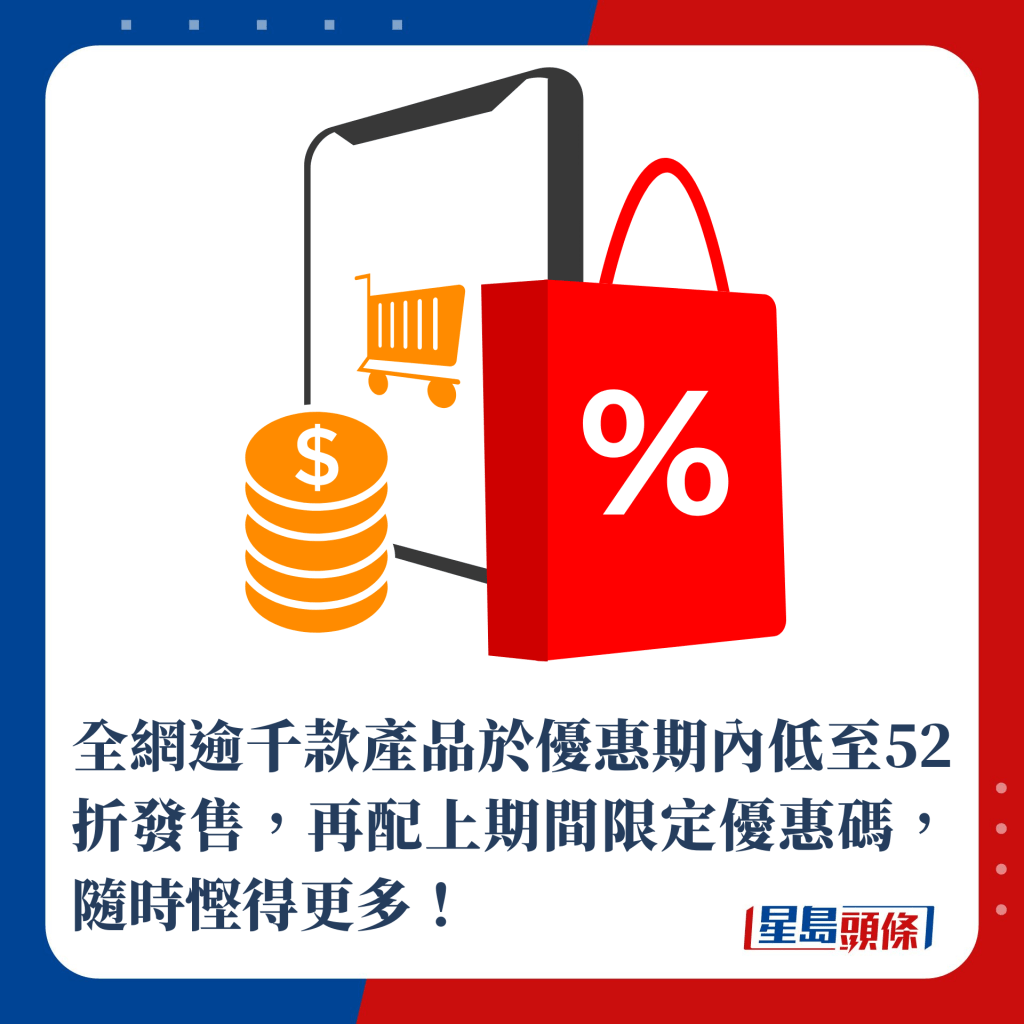 ▲全網逾千款產品于優惠期內低至52折發售,再配上期間限定優惠碼,隨時慳得更多!