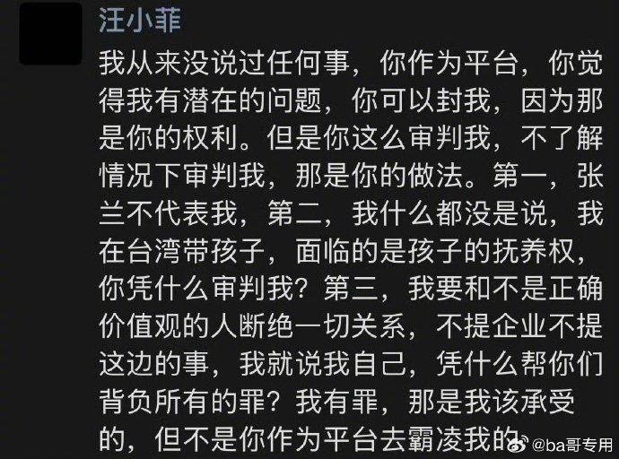 其后汪小菲在朋友圈直指,自己從來沒說過任何事,抖音作為平臺,覺得有潛在的問題,可以封他,因為那是平臺的權利?!暗悄氵@么審判我,不了解情況下審判我,那是你的做法?!苯又蔡岢?點,“第一,張蘭不代表我。第二,我什么都沒說,我在臺灣帶孩子,面臨的是孩子的撫養權,你憑什么審判我?第三,我要和不是正確價值觀的人斷絕一切關系,不提企業、不提這邊的事,我就說我自己,憑什么幫你們背負所有的罪?我有罪,那是我該承受的,但不是你作為平臺去霸凌我的”。網上更瘋傳汪小菲高喊“我不孝,但是絕對不能讓這種人獲得支持?!彼€稱吐露“她是我媽,可是我和她的三觀天地不合,我不是東西,我對不起所有人”接著就宣告“從今天起,我要和她斷絕所有關系”,更認為張蘭賺得錢已夠活幾輩子。