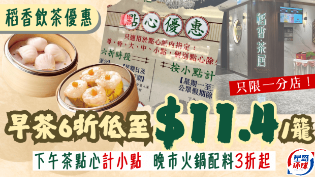 踏入蛇年,稻香旗下的“稻香. 茶居”推出早市、下午茶飲茶,以及晚市火鍋優惠。 于星期一至日的早茶時段,即星期一至六的早上11:55前入單、12:30前結賬及離座,以及逢星期日及公眾假期,早上10:55前入單、11:30前結賬及離座,即可以6折價錢品嘗點心紙內指定的尊、特、大、中、小點! 以星期一至六早茶點心價錢計錢,最平$11.4一籠,而星期日及公眾假期則低至$12.6。