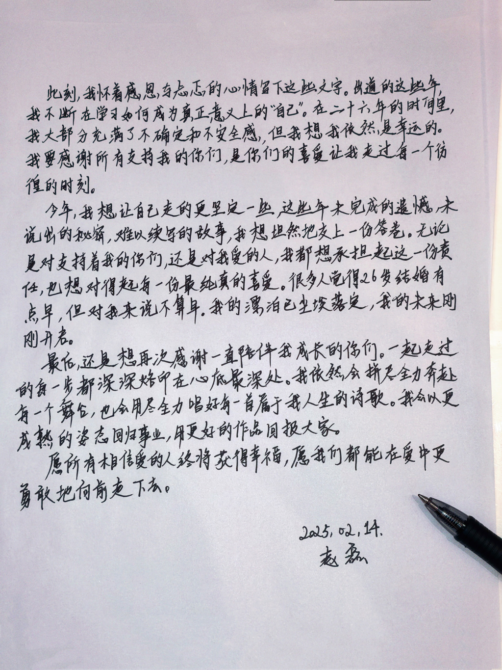 最后,趙磊再度感謝一路陪伴他成長的粉絲,婚后他會用更成熟的姿態回歸事業,依舊在舞臺上全力以赴,也會用盡全力唱好每首歌。