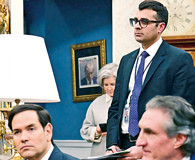 ▲總統特朗普重返白宮后,在橢圓形辦公室掛上自己2023年在喬州被拘控時登上《紐約郵報》頭版的大頭照。 法新社資料圖片