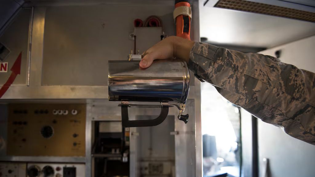 美國空軍飛行員展示KC-10加油機專用加熱咖啡杯。 (美國空軍技術中士James Hodgman)
