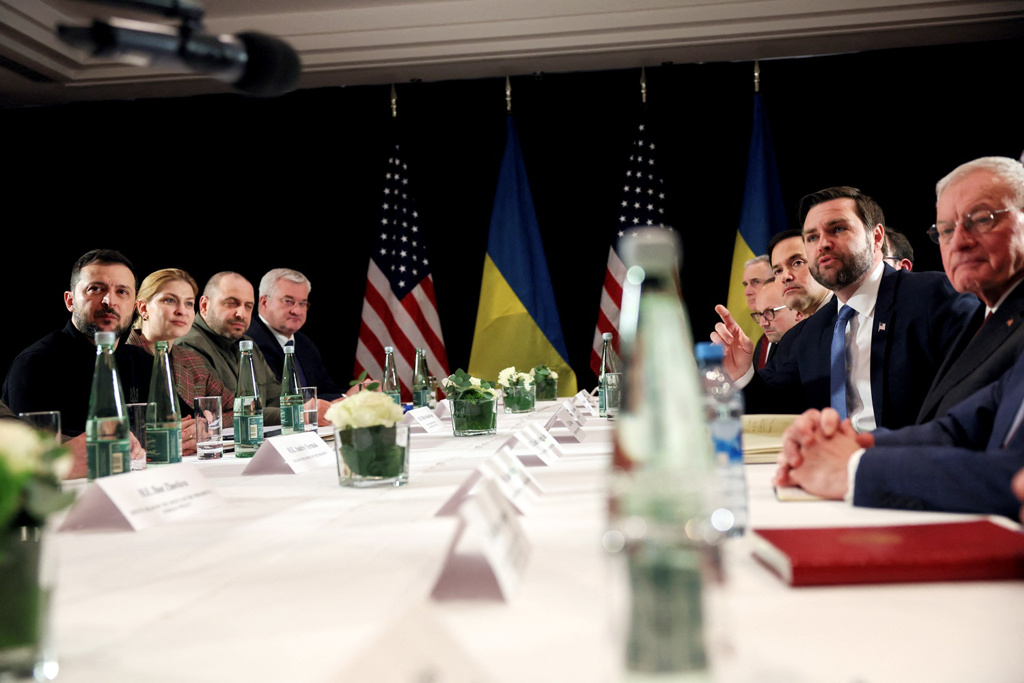 ▲澤連斯基與美國副總統萬斯率領的代表團,14日在慕尼黑安全會議舉行場邊會議。(路透社)