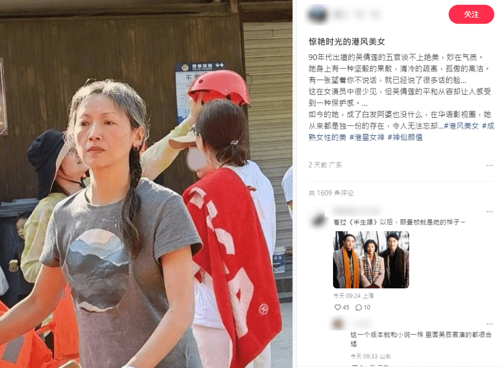 有網民前日(15日)在小紅書以“驚艷時光的港風美女”為題發帖,并寫道:“90年代出道的吳倩蓮的五官談不上絕美,妙在氣質。 她身上有一種堅毅的果敢,清冷的疏離,孤傲的高潔。 有一張望著你不說話,就已經說了很多話的臉... 這在女演員中很少見,但吳倩蓮的平和從容卻讓人感受到一種保護感。 … 如今的她,成了白發阿婆也沒什么,在華語影視圈,她從來都是獨一份的存在,令人無法忘卻...”更hashtag標注#港風美女#成熟女性的美#港星女神#神仙顏值